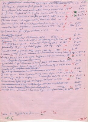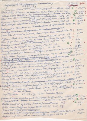 Auf einem herausgeschnittenen Blatt eines großen Briefumschlages wurde die Bestellliste für die Schulbücherei handschriftlich zusammen gestellt. Hinter jedem Titel ist der Einkauswert vermerkt.