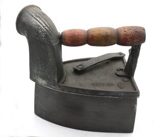 Kleines Kohlebügeleisen mit Kamin. In den Bauch des Bügeleisens wurde glühende (Holz-)Kohle eingefüllt um dessen Boden für das Bügeln zu erhitzen. Dazu konnte der Deckel, der mit einem Scharnier an der Rückseite verbunden war nach hinten hochgeklappt werden. Nach der Befüllung wurde dieser wieder heruntergeklappt und mit einem Riegel verschlossen. Durch einen kleinen Kamin konnte der Rauch abziehen. Der Kamin ist relativ schlicht gestaltet, ohne den bei Vergleichsexemplaren oft vorhandenen Drachenkopf. Der gedrechselte Holzgriff ist auf der einen Seite am Kamin auf der anderen Seite auf einem Stift befestigt. Auf der Rückseite befindet sich eine Klappe mit der Aufschrift 99 (oder 199) zur Regulierung des Luftzugs. Auf der Oberseite des Deckels befindet sich die Aufschrift VIJAY und die Zahl 9. In Mumbay/Indien gibt es eine gleichnamige Firma, die 1967 gegründet wurde und Elektroartikel vertreibt und bei etsy sind im indischen Stil verzierte Deco-Bügeleisen unter diesem Namen zu kaufen. Ein Zusammenhang mit diesem Objekt erscheint aber eher nicht gegeben. Im Vergleich zu Kohlebügeleisen mit Rauchabzug unter dem Deckel des Eisens hat diese Konstruktion den Vorteil, dass die Büglerin nicht voll den gesundheitsschädlichen Rauch abbekommt. Das Bügeleisen wurde wahlweise mit der Kaminöffnung links oder rechts angeboten, je nachdem ob die Büglerin Links- oder Rechtshänderin war.