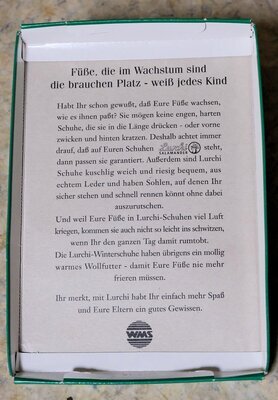 „Lurchi“, der Feuersalamander, war seit den 1950er Jahren, der Werbeträger für Salamander-Kinderschuhe. Über die vielen, lustigen Abenteuer von Lurchi, erfuhren die Kinder in einem gleichnamigen Comicheft, dass sie beim Kauf dieser Schuhmarke geschenkt bekamen. Die optische Verbindung zwischen Schuhkauf und „Lurchi´s Abenteuer“ war der Schuhkarton. Im Laufe der Zeit hat sich sein Design verändert. Unser Karton ist neueren Datums, da der VK schon in € angegeben ist.