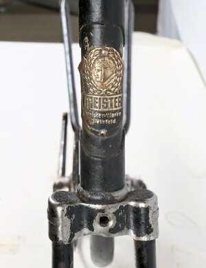 Der Fahrradrahmen (Damenrad) stammt von den "Meister Werken" in Bielefeld. Der Rahmen und die erhalten gebliebenen Schutzbleche hatte ursprünglich eine grün/weiße Lackierung, wurden aber irgendwann schwarz übergestrichen. Vor allem am hinteren Schutzblech sind Reste der alten Lackierung noch sichtbar(Bild). Der Rahmen hat eine Größe von 28 Zoll und wurde unter der Nummer 1 833 966 zwischen den Jahren 1940 – 1950 hergestellt. Ob sich am Rahmen Abziehbilder befanden ist nicht mehr mit Sicherheit feststellbar. Jedoch sind am Steuerrohr und am hinteren Schutzblech die geprägten Firmenlogo noch vorhanden.