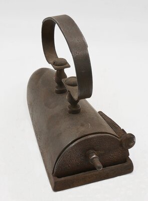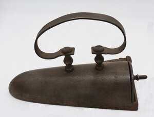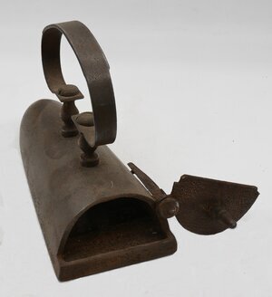 Einfaches Ochsenzungenbügeleisen mit fest angebrachtem Metallgriff in Form eines Eisenbands. Sein Name kommt daher, weil in das Innere des Bügeleisens ein ochsenzungenförmiger Eisenkeil von hinten eingeschoben werden kann. Dieser wird zuerst auf einem Herd erhitzt, dann eingeschoben und und der Boden des Bügeleisens erhitzt. Der Innenraum kann mit einer Klappe verschlossen werden, sodass der Eisenkeil nicht nach hinten herausfallen kann. Im Inneren des Bügeleisens befindet sich unten je eine Quer und Längs- bzw. Mittelrippe die verhindern, dass der Eisenkeil direkt auf dem Boden aufliegt. Im linken Feld durch die Mittelrippe getrennten Feld befindet sich die Gussmarke J T und über dem T ein Widder (oder ein Vogel mit langem Schnabel) und im rechten Feld die Zahl 5. Der passende Eisenkeil ist leider nicht erhalten.