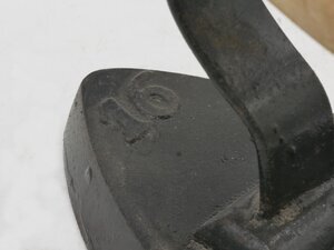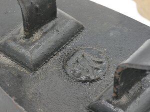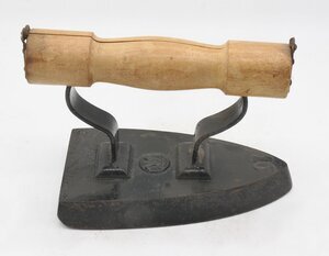 Das Bügeleisen besteht aus einem Fuß aus Gusseisen und einem eingesetzten bandförmigen Eisengriff in der rheinischen Form. Es gehört zu der Gruppe der Flach- bzw. Anlegeeisen. Das leichte Flachbügeleisen gehört zu den massiven Volleisen, die aus Eisen oder Stahlgeschmiedet oder gegossen und bereits ab dem 18. Jh. hergestellt wurden. Auf Grund seines geringen Gewichts und seiner flachen Sohle, die nahezu mühelos über die vorher mit Wasser besprengte Wäschegleitet, erfreute es sich noch weit bis ins 20. Jahthuindert hinein großer Beliebtheit. Das Erhitzen auf dem Kohleofen oder in einer offenen Feuerstelle wie dem Kaminfeuer erforderte jedoch verschiedene Vorsichtsmaßnahmen, um die Bügelwäsche nicht zu beschmutzen oder sich am fest verbundenen Metallgriff zu verbrennen. Viele Büglerinnen wischten daher nach dem Erhitzen des Eisens mit einem Tuch, das sie an ihrer Schürze befestigt hatten, über die Bügelsohle. Als Hitzeschutz wurde oftmals ein dicker Handschuh oder ein Lappen, der um den Griff gewickelt wurde, verwendet. Trotz seiner Zweckmäßigkeit weisen viele Flacheisen eine Verzierung der Deckplatte auf, die heute eine Herkunftsbestimmung erlaubt. In Frankreich wurden häufig Herzen, Früchte, Blumen und Wappen auf der Oberseite des Bügeleisens bevorzugt. In England zierten oftmals Sterne und Kronen die Deckplatte. Die deutschen und skandinavischen Eisen wurden hingegen vielfach schmucklos gestaltet oder mit einer Firmenmarke und den Initialen des Herstellers versehen. Neben diesen Verzierungselementen geben die Formen der Eisen und Griffe weitere Anhaltspunkte. Das vorliegende Flacheisen besitzt einen angegossenen Vollgriff und zeichnet sich durch seine breite, fast dreieckige Bügelsohle aus. Auf der Deckplatte befindet sich als Gussmarke ein Stern und die Größenbezeichnung "N 5". In der Mitte des Bügeleisens ist als Stempel je nach Blickrichtung ein M bzw. W zu erkennen. Möglicherweise ein Hinweis auf den Hersteller oder Besitzer. Das Flacheisen wurde am Herdfeuer oder auf dem Ofen erhitzt. Dadurch erihitzte sich auch der metallene Handgriff und bot wenig Schutz vor dem heißen Bügeleisen. Das vorliegende Exemplar bot einen gewissen Schutz durch einen abnehmbaren. gedrechselten Holzgriff der in der Mitte (der Länge nach) aufgeklappt und über den mittleren Teil des Henkels geklemmt werden konnte. War das Bügeleisen kalt geworden konnte dieser abgenommen und über ein baugliches frisch vom Ofen kommendes Exemplar geklemmt werden. In der Ausstellung steht das Bügeleisen auf dem Erhitzer HR 29.
