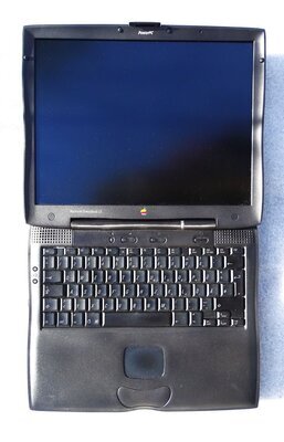 Laptop der Firma Apple. Das Powerbook G3 gehört zu einer Serie von Macintosh-PC´s der Firma Apple. Die G3-Serie wurde 1997 vorgestellt und bis 2001 angeboten. Bei dem im Besitz des Freilichtmuseums Roscheider Hof befindlichen Gerät handelt es sich um das Modell mit der Bezeichnung Wallstreet, welches 1998 vorgestellt wurde. Es verfügt über einen 14,1-Zoll-TFT-LCD Bildschirm, einen Prozessor mit einer Geschwindigkeit von 300 MHz, ein optisches CD-ROM-Laufwerk und ein herausnehmbares Lithium-Ionen-Akku. Die Festplatte besitzt die Größe von 8 MB. Am linken Gehäuserand befinden sich ein Schacht für ein zusätzliches Akku sowie ein 3,5-Zoll-Diskettenlaufwerk. Am rechten Gehäuserand ist ein größeres Laufwerk zur Aufnahme von CD´s und DVD´s angebracht. Am oberen Gehäuserand findet man Video- und Mikrobuchsen. Das Notebook hat ein Gewicht von mehr als 7 kg.
