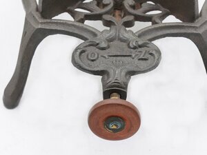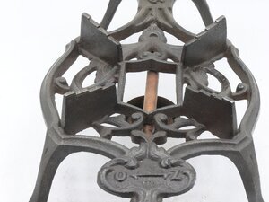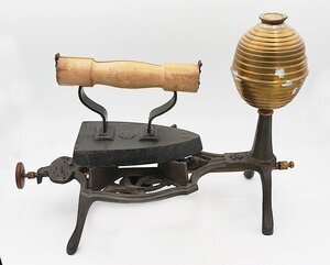 Erhitzer für Flachbügeleisen verschiedenster Größen. Wenn kein Küchherd, Ofen oder Schneiderhofen verfügbar war oder diese im Sommer zu heiß und energieinffizient gewesen wären konnte ein Flachbügeleisen hier erhitzt werden. Der Brennspiritus wurde in den kleinen Vorratsbehälter gefüllt. Von dort wurde erzu einem Brenner geleitet. Mit einer Regulierschraube konnte die Spirituszufuhr eingestellt werden. Auf dem rankenartigem stark durchbrochenem Dekor sitzen vier schmale oben in Treppenstufen auslaufenden Metallkeile. Auf diesen konnten Bügeleisen verschiedener genormter Größen zum Erhitzen sicher abgestellt werden. In der Ausstellung steht das Flachbügeleisen F 30 auf dem Erhitzer.