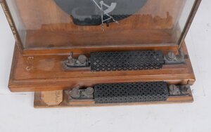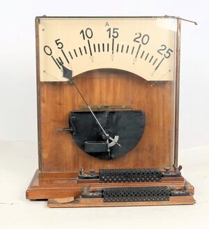 Elektrisches Messgerät für Demonstrationszwecke in der Schule. Das Gerät wurde ca. 1920 unter der Nummer 60609 von einem uns nicht bekannten Produzenten hergestellt. Gemessen wird die Stromstärke, wobei Vorwiderstände zwischen 0-0,5 bzw. 0 - 25 ausgewählt werden können. (Je nach Anschluss an den Klemmen)