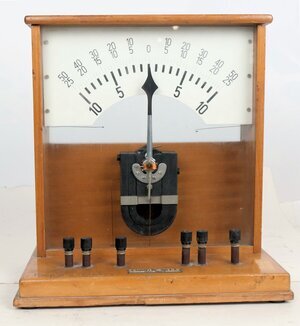 Dies Lehrgerät wurde im Unterricht eines Trierer Gymnasiums eingesetzt. Grundplatte und Seitenwände sind aus Holz gefertigt, die Vorderseite vollständig verglast. Es können damit die Stromspannung, wenn die Anschlussklemmen "V" belegt werden, oder die Stromstärke, bei Belegung der Klemmen "A" gemessen werden.