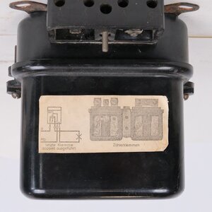 Der Wechselstromzähler, auch Verbrauchszähler, misst den Stromverbrauch z.Bsp. in einem Haushalt. Das würfelähnliche Gehäuse ist aus Bakelit gefertigt und hat an der Vorderseite ein Sichtfenster. Durch eine Glasscheibe ist der Stromfluss an der Drehscheibe erkennbar. Der insgesamt verbrauchter Strom wir über ein Zählwerk angezeigt. Auch die Gerätenummer und die Umdrehungszahl pro KW/h (600 Umdrehungen = 1 KW/h) können durch das Fenster abgelesen werden.