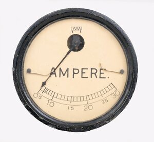 Auf Grund seiner Bauform ist der Amperemeter für eine Aufputzinstallation vorgesehen. Das schwarze Blechgehäuse hat eine runde Form mit hellem Zifferblatt. Der Zeiger ist hängend angeordnet, so dass die Werte im unteren Bereich abgelesen werden können. Die Skala reicht von 0-30 Ampere. Auf der Rückseite sind 2 Klemmen für die Zuleitungen. Das Gerät diente Schulungszwecken in einem Trierer Gymnasium.