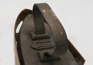 Das Bügeleisen besteht aus einem Fuß aus Gusseisen und einem eingesetzten bandförmigen Eisengriff in der rheinischen Form. Es gehört zu den massiven, schweren Volleisen, die aus Eisen oder Stahl geschmiedet oder gegossen und bereits ab dem 18. Jh. hergestellt wurden. Das Erhitzen auf dem Kohleofen oder in einer offenen Feuerstelle wie dem Kaminfeuer erforderte jedoch verschiedene Vorsichtsmaßnahmen, um die Bügelwäsche nicht zu beschmutzen oder sich am fest verbundenen Metallgriff zu verbrennen. Viele Büglerinnen wischten daher nach dem Erhitzen des Eisens mit einem Tuch, das sie an ihrer Schürze befestigt hatten, über die Bügelsohle. Als Hitzeschutz wurde oftmals ein dicker Handschuh oder ein Lappen, der um den Griff gewickelt wurde, verwendet. Aufgrund seiner Dicke hat es eine deutlich höhere Wärmekapazität als die Flacheisen. Zwischen den beiden Bügelbefestigungen ist als Relief in einer Kartusche die Gussmarke "BECO" zu erkennen. Dies könnte der Firmennamen sein, war von uns jedoch keinem Unternehmen zuordenbar. An der Spitze die Zahlt 18. Der Bügel ist nicht abnehmbar. Ob die kupferne Abstellplatte mit dem Bügeleisen zusammen ein Konvolut bildete läßt sich derzeit nicht nachweisen.