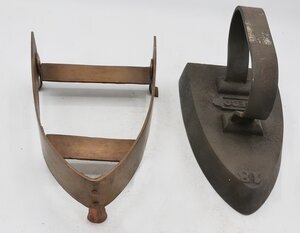 Das Bügeleisen besteht aus einem Fuß aus Gusseisen und einem eingesetzten bandförmigen Eisengriff in der rheinischen Form. Es gehört zu den massiven, schweren Volleisen, die aus Eisen oder Stahl geschmiedet oder gegossen und bereits ab dem 18. Jh. hergestellt wurden. Das Erhitzen auf dem Kohleofen oder in einer offenen Feuerstelle wie dem Kaminfeuer erforderte jedoch verschiedene Vorsichtsmaßnahmen, um die Bügelwäsche nicht zu beschmutzen oder sich am fest verbundenen Metallgriff zu verbrennen. Viele Büglerinnen wischten daher nach dem Erhitzen des Eisens mit einem Tuch, das sie an ihrer Schürze befestigt hatten, über die Bügelsohle. Als Hitzeschutz wurde oftmals ein dicker Handschuh oder ein Lappen, der um den Griff gewickelt wurde, verwendet. Aufgrund seiner Dicke hat es eine deutlich höhere Wärmekapazität als die Flacheisen. Zwischen den beiden Bügelbefestigungen ist als Relief in einer Kartusche die Gussmarke "BECO" zu erkennen. Dies könnte der Firmennamen sein, war von uns jedoch keinem Unternehmen zuordenbar. An der Spitze die Zahlt 18. Der Bügel ist nicht abnehmbar. Ob die kupferne Abstellplatte mit dem Bügeleisen zusammen ein Konvolut bildete läßt sich derzeit nicht nachweisen.