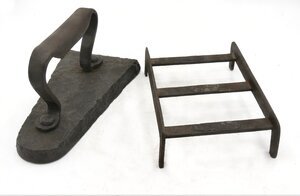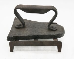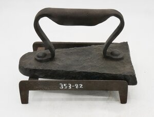 Das vorliegende Flacheisen ist ein besonders kleines und einfaches Exemplar. Die Oberseite und die Seitenwände haben eine vom Guss her raue Oberfäche. Die Spitze ist rund ausgeformt. Der Bügel mit typisch französischem Bügelgriff ist auf die Platte aufgenietet. Ob das Eisen mit der Abstellfläche auch schon früher ein Konvolut gebildet hat ist nicht nachzuweisen. Das leichte Flacheisen gehört zu den massiven Volleisen, die aus Eisen oder Stahl geschmiedet oder gegossen und bereits abdem 18. Jh. hergestellt wurden. Auf Grund seines geringen Gewichts und seiner flachen Sohle, die nahezu mühelos über die vorher mit Wasser besprengte Wäschegleitet, erfreute es sich noch weit bis ins 20. Jahthuindert hinein großer Beliebtheit. Das Erhitzen auf dem Kohleofen oder in einer offenen Feuerstelle wie dem Kaminfeuer erforderte jedoch verschiedene Vorsichtsmaßnahmen, um die Bügelwäsche nicht zu beschmutzen oder sich am fest verbundenen Metallgriff zu verbrennen. Viele Büglerinnen wischten daher nach dem Erhitzen des Eisens mit einem Tuch, das sie an ihrer Schürze befestigt hatten, über die Bügelsohle. Als Hitzeschutz wurde oftmals ein dicker Handschuh oder ein Lappen, der um den Griff gewickelt wurde, verwendet.