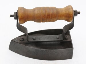 Kleines Blockeisen mit von oben her etwas ausgehöltem Corpus. Auf diesem ist mittels untereinander vernieteten und auf dem Eisen aufgeschraubten Eisenbändern ein gedrechselter Holzgriff mittels Schrauben und Muttern befestligt. Der Eisen ist von oben her etwas "ausgehöhlt" um das Gewicht des Eisens zu reduzieren. Die hatte den Nachteil, dass das Eisen weniger gut die Wärme hielt, machte es aber für das Reisegepäck geeigneter und auch für Frauen benutzbar. Es gehört zu den massiven, schweren Volleisen, die aus Eisen oder Stahl geschmiedet oder gegossen und bereits ab dem 18. Jh. hergestellt wurden. Das Erhitzen auf dem Kohleofen oder in einer offenen Feuerstelle wie dem Kaminfeuer erforderte jedoch verschiedene Vorsichtsmaßnahmen, um die Bügelwäsche nicht zu beschmutzen. Der Holzgriff hatte den Vorteil, dass er sich beim Erhitzen des Bügeleisens nicht auch erhitzte und so einen gewissen Schutz vor Verbrennungen bot.