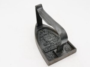 Flachbügeleisen Marke "Le Parisien" mit dem Pariser Stadtwappen als Gussmarke. Das Bügeleisen zeigt auf seiner Oberseite ein Relief mit dem gekrönten Pariser Stadtwappen und den Schriftzug "I E PARISIENNE No 6" Es besitzt einen angegossenen Bügelgriff mit Nase - eine typisch französische Form. Das leichte Flachbügeleisen gehört zu den massiven Volleisen, die aus Eisen oder Stahl geschmiedet oder gegossen und bereits ab dem 18. Jh. hergestellt wurden. Auf Grund seines geringen Gewichts und seiner flachen Sohle, die nahezu mühelos über die vorher mit Wasser besprengte Wäsche gleitet, erfreute es sich noch weit bis ins 20. Jahrhundert hinein großer Beliebtheit. Das Erhitzen auf dem Kohleofen oder in einer offenen Feuerstelle wie dem Kaminfeuer erforderte jedoch verschiedene Vorsichtsmaßnahmen, um die Bügelwäsche nicht zu beschmutzen oder sich am fest verbundenen Metallgriff zu verbrennen. Viele Büglerinnen wischten daher nach dem Erhitzen des Eisens mit einem Tuch, das sie an ihrer Schürze befestigt hatten, über die Bügelsohle. Als Hitzeschutz wurde oftmals ein dicker Handschuh oder ein Lappen, der um den Griff gewickelt wurde, verwendet.