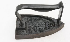 Flachbügeleisen Marke "Le Parisien" mit dem Pariser Stadtwappen als Gussmarke. Das Bügeleisen zeigt auf seiner Oberseite ein Relief mit dem gekrönten Pariser Stadtwappen und den Schriftzug "I E PARISIENNE No 6" Es besitzt einen angegossenen Bügelgriff mit Nase - eine typisch französische Form. Das leichte Flachbügeleisen gehört zu den massiven Volleisen, die aus Eisen oder Stahl geschmiedet oder gegossen und bereits ab dem 18. Jh. hergestellt wurden. Auf Grund seines geringen Gewichts und seiner flachen Sohle, die nahezu mühelos über die vorher mit Wasser besprengte Wäsche gleitet, erfreute es sich noch weit bis ins 20. Jahrhundert hinein großer Beliebtheit. Das Erhitzen auf dem Kohleofen oder in einer offenen Feuerstelle wie dem Kaminfeuer erforderte jedoch verschiedene Vorsichtsmaßnahmen, um die Bügelwäsche nicht zu beschmutzen oder sich am fest verbundenen Metallgriff zu verbrennen. Viele Büglerinnen wischten daher nach dem Erhitzen des Eisens mit einem Tuch, das sie an ihrer Schürze befestigt hatten, über die Bügelsohle. Als Hitzeschutz wurde oftmals ein dicker Handschuh oder ein Lappen, der um den Griff gewickelt wurde, verwendet.