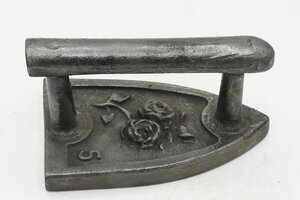 Kleines Flacheisen mit einem Relief eines Rosenasts mit zwei Blüten auf der Oberseite des Eisens (möglicherweise die Gussmarke des Herstellers). Da Flacheisen mit Deko typischerweise in Frankreich hergestellt wurden, kann eine französischer Produktion angenommen werden. Es besitzt einen geraden Bügelgriff und zwei Säulen die auf dem Eisen angegossen sind. Das leichte Flachbügeleisen gehört zu den massiven Volleisen, die aus Eisen oder Stahl geschmiedet oder gegossen und bereits ab dem 18. Jh. hergestellt wurden. Auf Grund seines geringen Gewichts und seiner flachen Sohle, die nahezu mühelos über die vorher mit Wasser besprengte Wäschegleitet, erfreute es sich noch weit bis ins 20. Jahrhundert hinein großer Beliebtheit. Das Erhitzen auf dem Kohleofen oder in einer offenen Feuerstelle wie dem Kaminfeuer erforderte jedoch verschiedene Vorsichtsmaßnahmen, um die Bügelwäsche nicht zu beschmutzen oder sich am fest verbundenen Metallgriff zu verbrennen. Viele Büglerinnen wischten daher nach dem Erhitzen des Eisens mit einem Tuch, das sie an ihrer Schürze befestigt hatten, über die Bügelsohle. Als Hitzeschutz wurde oftmals ein dicker Handschuh oder ein Lappen, der um den Griff gewickelt wurde, verwendet.