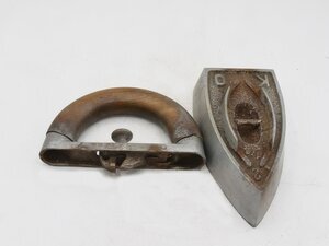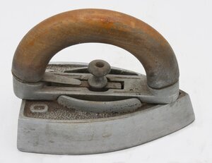 Bügeleisen (Satzeisen) aus Grauguss mit halbrundem Holzgriff: Das Bügeleisen besitzt einen ausklinkbaren Holzgriff und wird wegen des Auswechselmechanismus als Satzeisen bezeichnet. Konkret wird durch den Druck auf den Knopf unter dem Holzgriff ein darunter befindlicher Haken gelöst, der einen Stift im Eisen umfasst und so den Bügel mit dem Eisen verbindet. Vor dem Bügeln wurde das Eisen auf einem Herd erhitzt und anschließend der Holzgriff aufgesetzt, um die Wäsche zu glätten. Mittels eines Druckknopfes lässt sich der Griff lösen. So war es möglich mit mehreren Eisen zu arbeiten. Auf der Oberfläche des Eisens befinden sich als Gussmarke die Buchstaben K und O sowie die Ziffer 2. Satzeisen gehen auf ein amerikanisches Patent aus dem Jahre 1871 zurück. Sie besitzen eine mit Asbest isolierte Bügeleisendecke und einen ausklinkbaren Holzgriff den man auf auf eines der meist 4 Eisen klemmen konnte. Im Laufe der Zeit entwickelten die Hersteller viele verschiedene Klemmmechanismen. Vor dem Bügeln wurde das Eisen auf einem Herd erhitzt und anschließend der Holzgriff aufgesetzt, um die Wäsche zu glätten. Beim Bügeln werden mehrere Eisen gleichzeitig auf einem Ofen aufgeheizt. Ein Eisen wird an den Griff geklemmt und mit diesem wird gebügelt. Wird das Eisen im Laufe der Zeit zu kalt, so wird der Griff abgeklemmt und an ein anderes, heißes angeklemmt. Sofort kann dann mit diesem gebügelt werden und das erkaltete Unterteil wird auf den Herd gestellt. Satzeisen setzten sich schnell durch, da sie im Vergleich zu Bolzeneisen viel einfacher und sicherer zu bedienen waren. Auch nach der Elektrifizierung waren sie auch aus Sparsamkeitsgründen noch lange in Gebrauch.