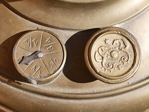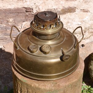Petroleumlampe / Petroleumofen aus Messing mit Glasaufsatz Die Lampe besteht aus 2 Teilen: Einem runden Fuß zur Aufnahme des Petroleums mit Einfüllstutzen, Anzeige des Füllstands mit einem Zeiger und einem Rad zur Regulierung der Petroleumzufuhr zum Brenner, der den obersten Teil des Fußes bildet. Er sitzt oben am Fuß und bildet mit diesem zusammen eine Einheit. Das darüberliegende Glas wird zwischen dem Brenner und einer Bordüre eingesteckt und ist zylindrisch - mit Ausnahme einer kugeligen Ausbuchtung, die für Flammscheibenbrenner typisch ist. Ganz oben auf dem Glasaufsatz ist ein Firmenlogo zu finden. Dieses bezieht sich jedoch nur auf den Hersteller des Glasaufsatzes. Der Schriftzug "S. REICH & CO WIEN" und zwei Pfeile umschließen eine Lampe im Stil des Art Decos. Auf dem Füllstutzen des Petroleumbehälters, der gleichzeitig auch der Fuß der Lampe ist, ist das Firmenlogo der Lampen-Fabrik Ehrich & Graetz OHG zu sehen. Es zeigt links und rechts je ein Seepferdchen und in der Mitte zwischen diesen von oben nach unten einen Stern, eine Sonne und ganz unten die untereinander verschlungenen Buchstaben E und G (für den Ehrich und Gaertz). Eine Besonderheit dieser Petroleumlampe ist, dass sie einen Flammscheibenbrenner besitzt. Diese Flamm- (auch Brand-)scheibe wurde wenige Millimeter über dem Dochtende platziert. Die Flamme „stößt“ auf dem Weg nach oben gegen diese Scheibe und wird dadurch „breiter“ und somit auch etwas heller. Flammscheibenbrenner benötigen einen speziellen Glaszylinder mit kugeliger Ausbuchtung, um der Flamme entsprechend Platz zu lassen. Die Helligkeit dieser Lampen und die Wärme, die sie verbreiten ist erstaunlich. Ebenso sind diese Brenner übermäßig „durstig“. Der Verbrauch steigt überproportional. Lampen mit solchen Brennern befanden sich fast nur in „reichen“ Haushalten.