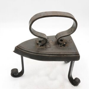 Einfaches Flacheisen, das auf der hochbeinigen Ablageplatte festgeklebt wurde. Bügel aus Eisenband nicht mehr original und neben den ursprünglichen Löchern auf der Oberseite des Eisens befestigt. Gussmarke: Buchstaben auf der Oberseite des Eisens: W E W 8