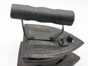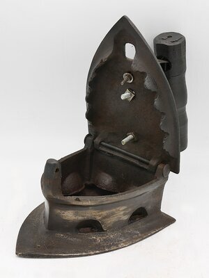 Das Bügeleisen ist ein sogenanntes Augeneisen mit einem gedrechselten Holzgriff. Augeneisen wurden seit etwa 1870 hergestellt und sind die Weiterentwicklung eines sogenanntes Kohleneisen. Die Augen dienen zur Verbesserung der Luftzufuhr. Kohleisen sind ein Bügeleisen aus Eisen mit nach hinten aufklappbarem Deckel mit Holzgriff. Die Bügelsohle besteht aus dickem Eisenblech, der Kohlebehälter besteht aus dünnerem Eisen. Die Bügelsohle ragt in hinteren Teil über den Kohlebehälter heraus. In den aufklappbaren Deckel konnte glühende Kohle eingefüllt werden. An beiden Seiten des Bügeleisens befinden sich unten je zwei "Augen" und zwischen Eisen und Deckel ein Spalt zur Ermöglichung der Luftzirkulation bei der brennenden Kohle. Die Klappe kann mit einem Haken und einem Loch in einem von unten kommenden Stift oberhalb des Deckels fixiert werden. An dem Deckel ist mit 2 Schrauben ein Bügel angeschraubt, der oben von einem gedrechselten Holz umschlossen wird. Auf dem Deckel befinden sich die Schriftzüge "8 AMSON" und "TESTED". Könnte eventuell eine Herstellerangabe sein. AMSON könnte sich auf einen indischen Hersteller in Noida, Uttar Pradesh beziehen der heute neben vielen anderen Produkten auch Bügeleisen vertreibt und vielleicht auch selber herstellt. Bügeleisen werden seit dem 17. Jahrhundert zum Glätten der Wäsche verwendet. Die ersten Bügeleisen bestanden aus einer Metallplatte und einem bügelartigem Griff. Daher auch der Name.