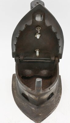 Das Bügeleisen ist ein sogenanntes Augeneisen mit einem gedrechselten Holzgriff. Augeneisen wurden seit etwa 1870 hergestellt und sind die Weiterentwicklung eines sogenanntes Kohleneisen. Die Augen dienen zur Verbesserung der Luftzufuhr. Kohleisen sind ein Bügeleisen aus Eisen mit nach hinten aufklappbarem Deckel mit Holzgriff. Die Bügelsohle besteht aus dickem Eisenblech, der Kohlebehälter besteht aus dünnerem Eisen. Die Bügelsohle ragt in hinteren Teil über den Kohlebehälter heraus. In den aufklappbaren Deckel konnte glühende Kohle eingefüllt werden. An beiden Seiten des Bügeleisens befinden sich unten je zwei "Augen" und zwischen Eisen und Deckel ein Spalt zur Ermöglichung der Luftzirkulation bei der brennenden Kohle. Die Klappe kann mit einem Haken und einem Loch in einem von unten kommenden Stift oberhalb des Deckels fixiert werden. An dem Deckel ist mit 2 Schrauben ein Bügel angeschraubt, der oben von einem gedrechselten Holz umschlossen wird. Auf dem Deckel befinden sich die Schriftzüge "8 AMSON" und "TESTED". Könnte eventuell eine Herstellerangabe sein. AMSON könnte sich auf einen indischen Hersteller in Noida, Uttar Pradesh beziehen der heute neben vielen anderen Produkten auch Bügeleisen vertreibt und vielleicht auch selber herstellt. Bügeleisen werden seit dem 17. Jahrhundert zum Glätten der Wäsche verwendet. Die ersten Bügeleisen bestanden aus einer Metallplatte und einem bügelartigem Griff. Daher auch der Name.