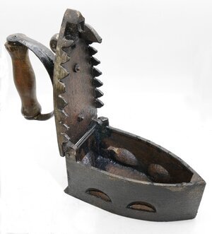 Das vorliegende Bügeleisen ist ein sogenanntes Augeneisen mit einem gedrechselten Holzgriff. Augeneisen wurden seit etwa 1870 hergestellt und sind die Weiterentwicklung eines sogenanntes Kohleneisen. Die Augen dienen zur Verbesserung der Luftzufuhr. Kohleisen sind ein Bügeleisen aus Eisen mit nach hinten aufklappbarem Deckel mit Holzgriff. In den aufklappbaren Deckel eines Kohleneisens konnte glühende Holzkohlenasche eingefüllt werden. Die Bügelsohle besteht aus dickem Eisenblech, der Kohlebehälter besteht aus dünnerem Eisen. Die Bügelsohle ragt in hinteren Teil über den Kohlebehälter heraus. Mit einer Klappe auf der Rückseiten, unten über der Bügelsohle, konnte Asche ausgeschüttet werden. An beiden Seiten des Bügeleisens befinden sich unten je zwei "Augen" und zwischen Eisen und Deckel befindet sich ein Spalt zur Ermöglichung der Luftzirkulation bei der brennenden Kohle. Die Deckel kann mit einem Metallknopf und einem automatischen Reibeverschluss unterhalb des Deckels fixiert werden. An dem Deckel ist mit 2 Schrauben ein Henkel angeschraubt. Seine beiden Äste tragen oben einen Holzgriff. Seine beiden "Füßchen" sind mit Schrauben am Deckel des Eisens befestigt. Der Rost ist leider nicht erhalten. Bügeleisen werden seit dem 17. Jahrhundert zum Glätten der Wäsche verwendet. Die ersten Bügeleisen bestanden aus einer Metallplatte und einem bügelartigem Griff. Daher auch der Name.