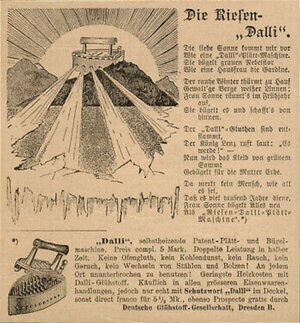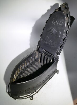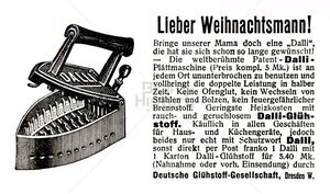 Bügeleisen werden seit dem 17. Jahrhundert zum Glätten der Wäsche verwendet. Die ersten Bügeleisen bestanden aus einer Metallplatte und einem bügelartigem Griff. Daher auch der Name. Das vorliegende Bügeleisen ist ein Glühstoffeisen der "Deutschen Glühstoff Gesellschaft, Dresden". Glühstoffbügeleisen sind eine Weiterentwicklung der Kohleeisen. Das erste Patent für ein Glühstoffeisen wurde 1877 erteilt. Glühstoff ist eine Art Holzkohlenbrikett, gepulverte Holzkohle, die mit Teer und Natronlauge behandelt in Form gepreßt und verkokt (entgast) wurde. Glühstoff diente zum Kochen, Plätten, Bügeln, Warmhalten etc. Ein sogenannter Glühbolzen wurde zum Bügeln ausserhalb des Eisens angezündet und in das Eisen eingeführt. Er konnte bis zu 10 Stunden ununterbrochen glühen und so das Fortarbeiten ermöglichen. Im Vergleich zum Kohlebügeleisen hat er kaum Staub, Ruß und Giftgase emittiert. Diese Fortschritte wurden nicht nur in Fachzeitschriften ausführlich beworben. Ein Holzgriff ist mit zwei auf den Decke geschweißten Eisenstangen befestigt. An der Rückseite des Eisens befindet sich auf einem kurzen Eisenband ein hölzerner ebenfalls später dungelgrau eingefärbten Knauf mit dem der Deckel verschlossen und wieder geöffnet werden kann. Im Inneraum ist unter dem Deckel eine sich mit dem Deckel öffnende Metallplatte mit der Aufschrift "DALLI Protector" angebracht. Zwischen den beiden übereinander angeordneten Wörtern ist eine Hand zu sehen. Dieser sollte verhindern, dass Teile der Briketts aus dem Lüftungsschlitz herausfallen können. Ebenfalls sind (wie bei einem Schweizereisen) Löcher unten an den Seitenteilen angebracht und im inneren durch ein feinmaschiges Gitter gesichert. In das Eisen konnten angeglühte Dalli-Glühstoff-Briketts eingeführt werden. Nach eigener Werbung entwickelte sich dabei weder Rauch noch Dunst oder lästige Hitze. Eine Füllung reichte für mehrere Stunden. Für die Briketts oder Glutbolzen wurden im Inneren am Boden und am Rand Rippen angebracht. Für die erforderliche Luftzufuhr sorgten seitlich angebrachte Öffnungen, die bei heftigem Hin- und Herschwenken die Kohlenglut neu entfachte. Aufschrift auf dem Deckel: DGGD (steht für Deutsche Glühwaren Gesellschaft Dresden) DALLI PATENT GERMAN MAKE Der Abstellrost ist auch noch vorhanden Die Patentschrift ist hier zu finden: https://depatisnet.dpma.de/DepatisNet/depatisnet?action=pdf&docid=DE000000075749A&xxxfull=1 Die Deutsche Glühstoff-Gesellschaft m.b.H. wurde vom deutsch-jüdischen Unternehmer Max Elb 1892 gegründet und bestand bis zur "Arisierung" der Nationalsozialisten.