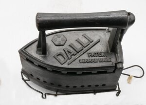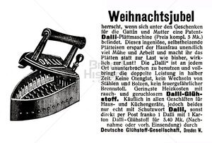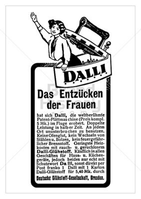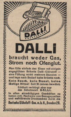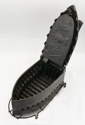 Bügeleisen werden seit dem 17. Jahrhundert zum Glätten der Wäsche verwendet. Die ersten Bügeleisen bestanden aus einer Metallplatte und einem bügelartigem Griff. Daher auch der Name. Das vorliegende Bügeleisen ist ein Glühstoffeisen der "Deutschen Glühstoff Gesellschaft, Dresden". Glühstoffbügeleisen sind eine Weiterentwicklung der Kohleeisen. Das erste Patent für ein Glühstoffeisen wurde 1877 erteilt. Glühstoff ist eine Art Holzkohlenbrikett, gepulverte Holzkohle, die mit Teer und Natronlauge behandelt in Form gepreßt und verkokt (entgast) wurde. Glühstoff diente zum Kochen, Plätten, Bügeln, Warmhalten etc. Ein sogenannter Glühbolzen wurde zum Bügeln ausserhalb des Eisens angezündet und in das Eisen eingeführt. Er konnte bis zu 10 Stunden ununterbrochen glühen und so das Fortarbeiten ermöglichen. Im Vergleich zum Kohlebügeleisen hat er kaum Staub, Ruß und Giftgase emittiert. Diese Fortschritte wurden nicht nur in Fachzeitschriften ausführlich beworben. Ein Holzgriff ist mit zwei auf den Decke geschweißten Eisenstangen befestigt. An der Rückseite des Eisens befindet sich auf einem kurzen Eisenband ein hölzerner ebenfalls später dungelgrau eingefärbten Knauf mit dem der Deckel verschlossen und wieder geöffnet werden kann. Im Inneraum ist unter dem Deckel eine sich mit dem Deckel öffnende Metallplatte mit der Aufschrift "DALLI Protector" angebracht. Zwischen den beiden übereinander angeordneten Wörtern ist eine Hand zu sehen. Dieser sollte verhindern, dass Teile der Briketts aus dem Lüftungsschlitz herausfallen können. Ebenfalls sind (wie bei einem Schweizereisen) Löcher unten an den Seitenteilen angebracht und im inneren durch ein feinmaschiges Gitter gesichert. In das Eisen konnten angeglühte Dalli-Glühstoff-Briketts eingeführt werden. Nach eigener Werbung entwickelte sich dabei weder Rauch noch Dunst oder lästige Hitze. Eine Füllung reichte für mehrere Stunden. Für die Briketts oder Glutbolzen wurden im Inneren am Boden und am Rand Rippen angebracht. Für die erforderliche Luftzufuhr sorgten seitlich angebrachte Öffnungen, die bei heftigem Hin- und Herschwenken die Kohlenglut neu entfachte. Aufschrift auf dem Deckel: DGGD (steht für Deutsche Glühwaren Gesellschaft Dresden) DALLI PATENT GERMAN MAKE Der Abstellrost ist auch noch vorhanden Die Patentschrift ist hier zu finden: https://depatisnet.dpma.de/DepatisNet/depatisnet?action=pdf&docid=DE000000075749A&xxxfull=1 Die Deutsche Glühstoff-Gesellschaft m.b.H. wurde vom deutsch-jüdischen Unternehmer Max Elb 1892 gegründet und bestand bis zur "Arisierung" der Nationalsozialisten.