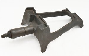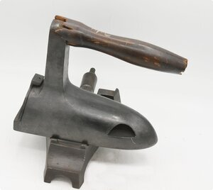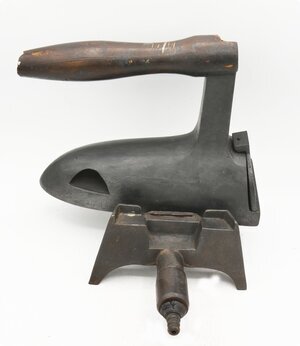 Ochsenzungenbügeleisen mit auf einem Stiel befestigtem Holzgriff. Der Name des Ochsenzungenbügeleisens kommt daher, weil in das Innere des Bügeleisens ein ochsenzungenförmiger Eisenkeil von hinten eingeschoben werden kann. Dieser wird zuerst auf einem Herd erhitzt, dann eingeschoben und und der Boden des Bügeleisens erhitzt. Der Innenraum kann mit einer Klappe verschlossen werden, sodass der Eisenkeil nicht nach hinten herausfallen kann. Der bügelartige Griff ist mit zwei Schrauben an dem Eisen befestigt. Der Boden des Innenraums ist rippenlos und flach. In der Mitte oben befindet sich eine Rippe, die mit einer Rinne im Keil korrespondiert. Dieses Objekt eines Ochsenzungenbügeleisen besitzt eine "Gasheizung". Das Bügeleisen besaß einen hohlem Rumpf und wahrscheinlich auch einen Metallkeil. Es konnte von aussen beheizt werden.