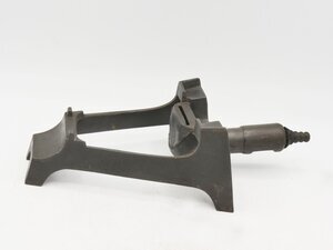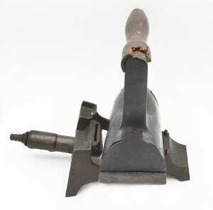 Ochsenzungenbügeleisen mit auf einem Stiel befestigtem Holzgriff. Der Name des Ochsenzungenbügeleisens kommt daher, weil in das Innere des Bügeleisens ein ochsenzungenförmiger Eisenkeil von hinten eingeschoben werden kann. Dieser wird zuerst auf einem Herd erhitzt, dann eingeschoben und und der Boden des Bügeleisens erhitzt. Der Innenraum kann mit einer Klappe verschlossen werden, sodass der Eisenkeil nicht nach hinten herausfallen kann. Der bügelartige Griff ist mit zwei Schrauben an dem Eisen befestigt. Der Boden des Innenraums ist rippenlos und flach. In der Mitte oben befindet sich eine Rippe, die mit einer Rinne im Keil korrespondiert. Dieses Objekt eines Ochsenzungenbügeleisen besitzt eine "Gasheizung". Das Bügeleisen besaß einen hohlem Rumpf und wahrscheinlich auch einen Metallkeil. Es konnte von aussen beheizt werden.