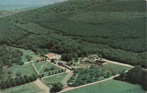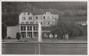 Buntdruck für Ansichtskarte mit Blick aus der Trinkhalle mit kleinem Kurpark. Auf der Wiese rechts ist ein Blumenrondell, mit rosa/violetten Blumen zu erkennen. Rechts neben dem durch eine Barriere abgegrenzten Bereich der Trinkbrunnen mit Gläsern. Vor der Barriere eine Sitzgruppe mit Korbstühlen und runtem Tisch. Vor der Trinkhalle ist ein breiter Weg zu erkennen, über den man direkt zu einigen Anwendungsräume gehen konnte. Auf der Rückseite ist der Bildeigentumsstempel aufgedruckt, mit Angaben zur Druckauflage und der Bildnummer/Jahr (246/61).
