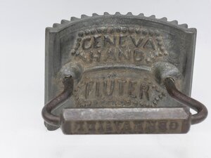 "Geneva hand fluter", Oberes Teil eines zweiteiliges Bügeleisen zum Bügeln von Plisseefalten. Der untere Teil ist nicht vorhanden. In zeitgenössischen Nachschlagewerken wird Charles A. Sterling aus New York, NY, der am 21. August 1866 das US-Patent Nr. 57.403 (siehe Link) für seine "improvement in fluting-machines" erhielt, als Erfinder des "Geneva Hand Fluter" genannt. In den in den 1870er Jahren veröffentlichten Illinois-Historien wird jedoch Walter D. Turner (ein Mitarbeiter oder Partner von Howell) als Erfinder genannt. Geneva bezieht sich nicht auf die Stadt der Schweiz, sondern auf Geneva (Illinois).