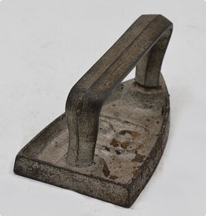 Flachbügeleisen (Kinderbügeleisen) mit Eisenbügel mit gerader und flacher Oberseite. Auf der Oberseite des Eisens als Gussmarke die Buchstaben PC. Sehr einfaches kleines Flacheisen, das auf der Herdplatte oder an einem Bügeleisenofen erhitzt werden musste. Das leichte Flachbügeleisen gehört zu den massiven Volleisen, die aus Eisen oder Stahlgeschmiedet oder gegossen und bereits ab dem 18. Jh. hergestellt wurden. Auf Grund seines geringen Gewichts und seiner flachen Sohle, die nahezu mühelos über die vorher mit Wasser besprengte Wäsche gleitet, erfreute es sich noch weit bis ins 20. Jahrhundert hinein großer Beliebtheit. Das Erhitzen auf dem Kohleofen oder in einer offenen Feuerstelle wie dem Kaminfeuer erforderte jedoch verschiedene Vorsichtsmaßnahmen, um die Bügelwäsche nicht zu beschmutzen oder sich am fest verbundenen Metallgriff zu verbrennen. Viele Büglerinnen wischten daher nach dem Erhitzen des Eisens mit einem Tuch, das sie an ihrer Schürze befestigt hatten, über die Bügelsohle. Als Hitzeschutz wurde oftmals ein dicker Handschuh oder ein Lappen, der um den Griff gewickelt wurde, verwendet.