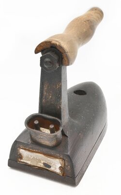 Bügeleisen werden seit dem 17. Jahrhundert zum Glätten der Wäsche verwendet. Die ersten Bügeleisen bestanden aus einer Metallplatte und einem bügelartigen Griff. Daher auch der Name. Mit der Elektrifizierung der Haushalte ab ca 1920 setzten sich Elektrobügeleisen mehr und mehr durch. Die Leistung der meisten Geräte lag bei etwa 500 W. Das Bügeleisen in Form eines traditionellen Ochsenzungenbügeleisens und einer nierigen Typnummer gehört zu einer frühen Generation von Elektrobügeleisen und besitzt noch keinen Termostat. Dies erforderte besondere Vorsicht und gegebenenfalls einen vorherigen Test beim Bügeln empfindlicher Kleidungsstücke. Das Elektrobügeleisen besitzt einen Holzgriff welcher an einem zusammen mit dem eigentlichen Eisen gegossen wurde, befestigt ist. Das Eisen besitzt als (männliche) Steckverbinder einen zweipoligen, sogenannten Waffel- oder Bügeleisenstecker, wie er für Heißgeräte wie Waffeleisen, Bügeleisen oder Wasserkochern verwendet wurde. Betrieben wird das Eisen bei 220 Volt sowie 550 Watt. Der Anschluss für das Elektrokabel ist als Stecker mit Metallummantelung ausgeführt. An der Rückseite ist ein Typenschild mit folgenden Texten angebracht: Grossag D.R. Type 250 G.M. 220 Volt 2 kg 550 Watt (D.R.G.M. steht für Deutsches Reich Geschmacksmuster, leider sind diese nicht mehr erhalten)