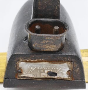 Bügeleisen werden seit dem 17. Jahrhundert zum Glätten der Wäsche verwendet. Die ersten Bügeleisen bestanden aus einer Metallplatte und einem bügelartigen Griff. Daher auch der Name. Mit der Elektrifizierung der Haushalte ab ca 1920 setzten sich Elektrobügeleisen mehr und mehr durch. Die Leistung der meisten Geräte lag bei etwa 500 W. Das Bügeleisen in Form eines traditionellen Ochsenzungenbügeleisens und einer nierigen Typnummer gehört zu einer frühen Generation von Elektrobügeleisen und besitzt noch keinen Termostat. Dies erforderte besondere Vorsicht und gegebenenfalls einen vorherigen Test beim Bügeln empfindlicher Kleidungsstücke. Das Elektrobügeleisen besitzt einen Holzgriff welcher an einem zusammen mit dem eigentlichen Eisen gegossen wurde, befestigt ist. Das Eisen besitzt als (männliche) Steckverbinder einen zweipoligen, sogenannten Waffel- oder Bügeleisenstecker, wie er für Heißgeräte wie Waffeleisen, Bügeleisen oder Wasserkochern verwendet wurde. Betrieben wird das Eisen bei 220 Volt sowie 550 Watt. Der Anschluss für das Elektrokabel ist als Stecker mit Metallummantelung ausgeführt. An der Rückseite ist ein Typenschild mit folgenden Texten angebracht: Grossag D.R. Type 250 G.M. 220 Volt 2 kg 550 Watt (D.R.G.M. steht für Deutsches Reich Geschmacksmuster, leider sind diese nicht mehr erhalten)