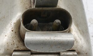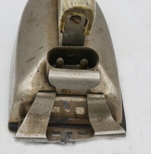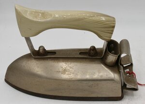 Das Elektrisches Bügeleisen ist ein Haubeneisen mit Gusseisensohle und einer Haube aus vernickeltem Eisenblech. Der Holzgriff ist mit einem Eisenband mit dem Eisen verbunden. Es besitzt als (männliche) Stecker einen zweipoligen, sogenannten Waffel- oder Bügeleisenstecker, wie er für Heißgeräte wie Waffeleisen, Bügeleisen oder Wasserkochern verwendet wurde. Der Anschluss für das Elektrokabel ist als Stecker mit Metallummantelung ausgeführt. Das Bügeleisen konnte ausschließlich mit Wechselstrom mit 240 Volt Spannung und 440 Watt Leistung betrieben werden. Das Bügeleisen besitzt keinen Thermostat. Bügeleisen werden seit dem 17. Jahrhundert zum Glätten der Wäsche verwendet. Die ersten Bügeleisen bestanden aus einer Metallplatte und einem bügelartigen aus Eisen. Daher auch der Name. Mit der Elektrifizierung der Haushalte setzten sich Elektrobügeleisen mehr und mehr durch. Die Leistung der Geräte lag bei meistes bei etwa 500 W. Das silberne Bügeleisen gehört zu einer frühen Generation von Elektrobügeleisen und besitzt noch keinen Thermostat. Dies erforderte besondere Vorsicht und gegebenenfalls einen vorherigen Test beim Bügeln empfindlicher Kleidungsstücke. Das Elektrobügeleisen besitzt einen weißen Griff, welcher an einem Eisenband befestigt ist, das mit Hutmuttern auf den Heizkörper geschraubt wurde. Das Glätteisen wurde mit einer Spannung von 220 Watt betrieben und besitzt als (männliche) Steckverbinder einen zweipoligen, sogenannten Waffel- oder Bügeleisenstecker, wie er für Heißgeräte wie Waffeleisen, Bügeleisen oder Wasserkochern verwendet wurde. Auf der Rückseite befand sich eine nicht mehr lesbare Beschriftung. Am hinteren Ende des Bügeleisens befindet sich eine Halte(?)vorrichtung.