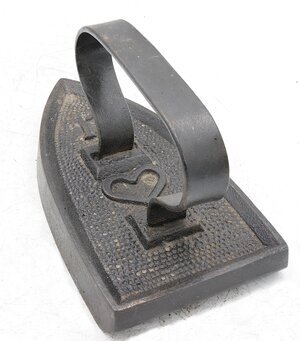 Kleines, sehr einfaches Flacheisen. Das Eisen besitzt einen Metallbügel im Rheinischen Stil als Griff. Auf der Oberfläche des Eisens befindet sich als Gussmarke ein Herz und an der Spitze die Ziffer 17. Das Bügeleisen besitzt eine Bügel in Form eines Eisenbands der vorne fast bis zur Spitze des Eisens reicht und einen etwas erhöhten Rand. Der Rost zum Abstellen des (heißen) Bügeleisens ist vorhanden. Das leichte Flachbügeleisen gehört zu den massiven Volleisen, die aus Eisen oder Stahl geschmiedet oder gegossen und bereits ab dem 18. Jh. hergestellt wurden. Auf Grund seines geringen Gewichts und seiner flachen Sohle, die nahezu mühelos über die vorher mit Wasser besprengte Wäsche gleitet, erfreute es sich noch weit bis ins 20. Jahrhundert hinein großer Beliebtheit. Das Erhitzen auf dem Kohleofen oder in einer offenen Feuerstelle wie dem Kaminfeuer erforderte jedoch verschiedene Vorsichtsmaßnahmen, um die Bügelwäsche nicht zu beschmutzen oder sich am fest verbundenen Metallgriff zu verbrennen. Viele Büglerinnen wischten daher nach dem Erhitzen des Eisens mit einem Tuch, das sie an ihrer Schürze befestigt hatten, über die Bügelsohle. Als Hitzeschutz wurde oftmals ein dicker Handschuh oder ein Lappen, der um den Griff gewickelt wurde, verwendet.