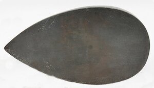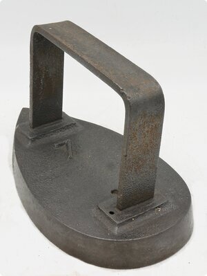 Einfaches herzförmiges Flachbügeleisen mit fast rechteckigem angegossenem Eisenbügel. Auf der Oberseite des Eisens befindet sich die Zahl 7. Das Eisen besitzt eine bauchige Form und besitzt eine glatte Oberfläche ohne Wulst am Rand. Ein Flacheisen wird auf der Herdplatte oder an einem Bügeleisenofen erhitz. Das leichte Flachbügeleisen gehört zu den massiven Volleisen, die aus Eisen oder Stahlgeschmiedet oder gegossen und bereits ab dem 18. Jh. hergestellt wurden. Auf Grund seines geringen Gewichts und seiner flachen Sohle, die nahezu mühelos über die vorher mit Wasser besprengte Wäsche gleitet, erfreute es sich noch weit bis ins 20. Jahrhundert hinein großer Beliebtheit. Das Erhitzen auf dem Kohleofen oder in einer offenen Feuerstelle wie dem Kaminfeuer erforderte jedoch verschiedene Vorsichtsmaßnahmen, um die Bügelwäsche nicht zu beschmutzen oder sich am fest verbundenen Metallgriff zu verbrennen. Viele Büglerinnen wischten daher nach dem Erhitzen des Eisens mit einem Tuch, das sie an ihrer Schürze befestigt hatten, über die Bügelsohle. Als Hitzeschutz wurde oftmals ein dicker Handschuh oder ein Lappen, der um den Griff gewickelt wurde, verwendet.