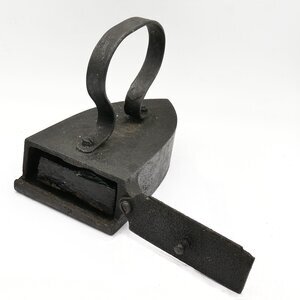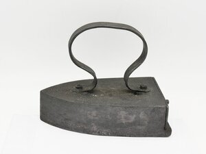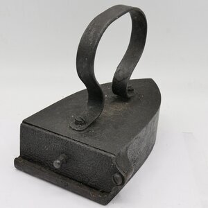 Bügeleisen werden seit dem 17. Jahrhundert zum Glätten der Wäsche verwendet. Die ersten Bügeleisen bestanden aus einer Metallplatte und einem bügelartigem Griff der Rheinischen Art. Daher auch der Name. Diese so genannten Plätteisen waren vom 17. bis zum 19. Jahrhundert in Gebrauch (und in ländlichen und abgelegenen Gebiete auch darüber hinaus). Im Gegensatz zur Urform mit Platte und Griff hat ein Kasteneisen einen dickeren und hohlen Rumpf, in den man am Herd oder Ofen aufgeheizte Metallstäbe bzw. Metallkeile oder einen Eisenkeil einfügen konnte. Wenn diese zu kalt waren wurden sie durch neu am Ofen aufgeheizte Exemplare ausgetauscht. Mehrer Exemplare der Metallstäbe waren dabei billiger als weitere Bügeleisen und ermöglichten ebenfalls ohne Unterbrechung zu bügeln. In diesen konnten Eisenstäbe eingeschoben werden konnten. Der Rumpf konnte mit einer Klappe oder einer Matallplatte mit Schiebemechanismus am hinteren Ende verschlossen werden, sodass die Metallstangen nicht herausfallen konnten. Das vorliegende Kasteneisen besitzt einen aus einem Eisenband hergestellen geschwungenen Bügel. Es hat an der Rückseite eine einfache, nach rechts aufklappbare Klappe, die im geschlossenen Zustand das Herausfalen des Bolzens verhindert. Der Bolzen wurde wohl bei der Musealisierung dieses Objekts in dem Eisen festgeklabt und läßt sich nicht mehr herausziehen.
