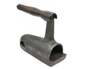 Dieses Bügeleisen wurde über einen Gasbrenner im Inneren aufgeheizt. Der Gasbrenner wurde durch einen langen Gummischlauch mit Gasluftgemisch gespeist. Gasbügeleisen waren im 19./20. Jahrhundert im Einsatz. Aus diesem Grund hat es eine geöffnete Rückseite und zwei "Augen" an der Vorderseite. Das Bügeleisen selbst ist in einem einzigen Stück hergestellt (wahrscheinlich Guss) worden, lediglich die Griffangel wurde mit einem Stück Holz versehen. In der Ausstellung hatte sich eine Spinne in dem Innenraum niedergelassen und dort mit ihrem Spinnennetz Insekten gefangen.