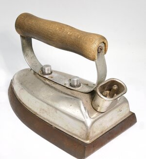 Das Elektrisches Bügeleisen ist ein Haubeneisen mit Gusseisensohle und einer Haube aus vernickeltem Eisenblech. Der Holzgriff ist an einem Eisenband, das mit 2 Hutmuttern auf dem Eisen befestigt ist, festgemacht. Es besitzt als (männliche) Stecker einen zweipoligen, sogenannten Waffel- oder Bügeleisenstecker, wie er für Heißgeräte wie Waffeleisen, Bügeleisen oder Wasserkochern verwendet wurde. Der Anschluss für das Elektrokabel ist als Stecker mit Metallummantelung ausgeführt. Das Bügeleisen konnte ausschließlich mit Wechselstrom mit 240 Volt Spannung und 440 Watt Leistung betrieben werden. Das Bügeleisen besitzt keinen Thermostat. Bügeleisen werden seit dem 17. Jahrhundert zum Glätten der Wäsche verwendet. Die ersten Bügeleisen bestanden aus einer Metallplatte und einem bügelartigen Griff aus Eisen. Daher auch der Name. Mit der Elektrifizierung der Haushalte setzten sich Elektrobügeleisen - ab etwa 1920 - mehr und mehr durch. Das Bügeleisen erinnert von seiner Form her etwas an die früheren Ochsenzungenbügeleisen. Es besitzt als (männliche) Stecker, einen zweipoligen, sogenannten Waffel- oder Bügeleisenstecker, wie er für Heißgeräte wie Waffeleisen, Bügeleisen oder Wasserkochern verwendet wurde. Der Holzgriff ist mit zwei Eisenbändern und Nieten am Eisen befestigt. Leider ist das Typenschild nicht mehr vorhanden.