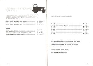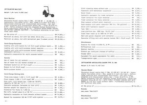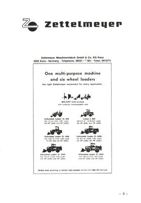 20seitige, englischsprachige Preisliste für den Export. Die Broschüre beinhaltet die ab dem 01.01.1977 gültigen Preise für die von der Firma Zettelmeyer hergestellten Mehrzweckmaschinen, für sechs unterschiedliche Radlader-Modelle, sowie eine Straßenwalze. Neben den Preisen für die Baumaschinen enthält die Broschüre Beschreibungen und die Preise für das angebotene jeweilige Zubehör. Auf den einzelnen Seiten befindet sich im oberen Teil eine kleine Skizze der Maschine, die Typenangabe und das Gewicht der jeweiligen Maschine und darunter in Listenform die Beschreibungen mit den in DM angegebenen Modell- und Zubehörpreisen. Die Preise der Baumaschinen bewegen sich zwischen 29.950,- DM für eine Mehrzweckmaschine mit 4-Gang-Getriebe und 250.660,- DM für den Radlader Typ ZL 4000. Die Preise für das angebotene Zubehör lagen zwischen 155,- DM und 24.425,- DM. Die beiden äußeren Seiten der in DIN A5-Größe gehaltenen Preisliste besitzen einen roten Hintergrund. Auf der Rückseite befindet sich eine Übersicht über die angebotenen Maschinen sowie die Kontaktdaten der Firma.