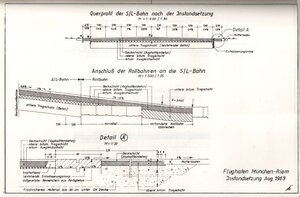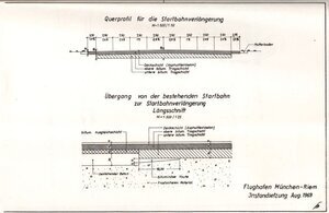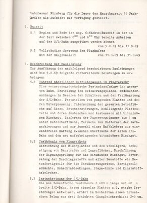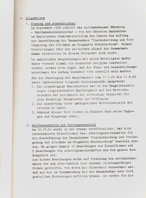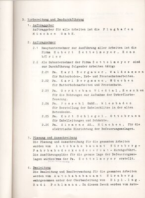 Informationsschreiben zu der im August 1969 durchzuführenden Instandsetzung und Verlängerung der Start- und Landebahn am Flughafen München-Riem. Der Flughafen München-Riem wurde vom 11.08. bis 31.08.1969 geschlossen, um die Start- und Landebahn zu sanieren sowie diese um 204 Meter auf eine Länge von 2804 Meter zu verlängert. Die Firma Hubert Zettelmeyer erhielt den Auftrag und beschäftigte hierfür insgesamt 6 Subunternehmer. Die Broschüre enthält auf 8 DIN A4-Seiten Angaben zur Planung und Ausschreibung der Baumaßnahme, zur Auftragsvergabe und der Bauleitung sowie eine Beschreibung der durchgeführten Arbeiten. Daneben befindet sich in dem im DIN A4-Größe gebundenen Heft ein gefalteter Lageplan des Flughafen und der Umgebung, 2 Zeichnungen mit Hinweisen zur Bauausführung sowie ein von der Firma Zettelmeyer erstellter Plan der sogenannten Befeuerungsanlagen. Befeuerungsanlagen werden zur Ausleuchtung der Start- und Landebahn benötigt. Es handelt sich hierbei um farbige, im Boden eingelassene Lampen, die als Feuer bezeichnet werden.