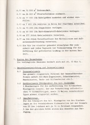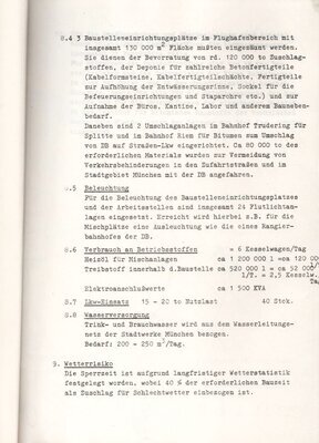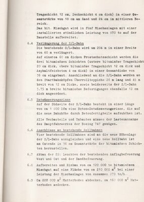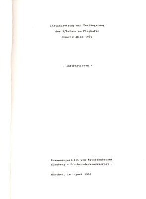 Informationsschreiben zu der im August 1969 durchzuführenden Instandsetzung und Verlängerung der Start- und Landebahn am Flughafen München-Riem. Der Flughafen München-Riem wurde vom 11.08. bis 31.08.1969 geschlossen, um die Start- und Landebahn zu sanieren sowie diese um 204 Meter auf eine Länge von 2804 Meter zu verlängert. Die Firma Hubert Zettelmeyer erhielt den Auftrag und beschäftigte hierfür insgesamt 6 Subunternehmer. Die Broschüre enthält auf 8 DIN A4-Seiten Angaben zur Planung und Ausschreibung der Baumaßnahme, zur Auftragsvergabe und der Bauleitung sowie eine Beschreibung der durchgeführten Arbeiten. Daneben befindet sich in dem im DIN A4-Größe gebundenen Heft ein gefalteter Lageplan des Flughafen und der Umgebung, 2 Zeichnungen mit Hinweisen zur Bauausführung sowie ein von der Firma Zettelmeyer erstellter Plan der sogenannten Befeuerungsanlagen. Befeuerungsanlagen werden zur Ausleuchtung der Start- und Landebahn benötigt. Es handelt sich hierbei um farbige, im Boden eingelassene Lampen, die als Feuer bezeichnet werden.