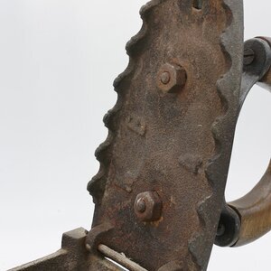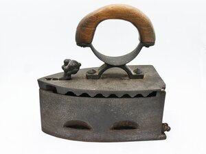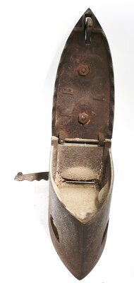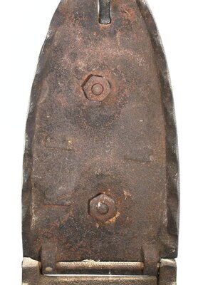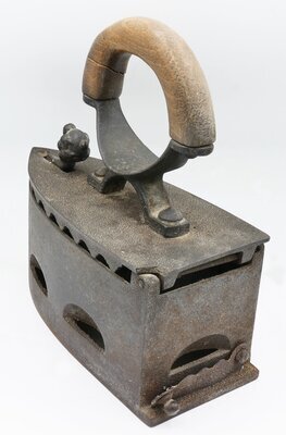 Bügeleisen werden seit dem 17. Jahrhundert zum Glätten der Wäsche verwendet. Die ersten Bügeleisen bestanden aus einer Metallplatte und einem bügelartigem Griff. Daher auch der Name. Das vorliegende Bügeleisen ist ein sogenanntes Kohleneisen, ein Bügeleisen aus Eisen mit nach hinten aufklappbarem Deckel mit Holzgriff. In den aufklappbaren Deckel eines Kohleneisens konnte glühende Kohlenasche eingefüllt werden. Der Deckel wird mit einem automatischen Reiberverschlussm der mit einer eiserner Löwenpfote verziert ist, gehalten. Die Bügelsohle besteht aus dickem Eisenblech, der Kohlebehälter besteht aus dünnerem Eisen. Die Bügelsohle ragt in hinteren Teil über den Kohlebehälter heraus. Mit einer Klappe auf der Rückseiten, unten über der Bügelsohle, konnte Asche ausgeschüttet werden. In den aufklappbaren Deckel eines Kohleneisens konnte glühende Kohle eingefüllt werden. Der Deckel kann mit einem Haken an einer von unten kommende und eine Kugel umspannende eiserner Löwenpfote fixiert werden. An dem Deckel ist mit 2 Schrauben die unten mit einer Mutter fixiert sind ein Henkel angeschraubt. Seine beiden Äste tragen oben einen gebogenen Holzgriff. Der Rost im Inneren ist leider nicht erhalten. Auf der Unterseite des Deckels finden sich die Buchstaben K und B (wahrscheinlich die Initialen des Herstellers) sowie die Ziffer 4. Das Bügeleisen ist nahezu identisch mit dem Eisen HR 95, HR 105 und HR 136 und HR 386.