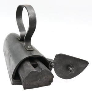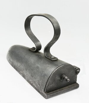 Der Name des Ochsenzungenbügeleisens kommt daher, weil in das Innere des in einem Stück gegossenen Bügeleisens ein ochsenzungenförmiger Eisenkeil von hinten eingeschoben werden kann. Dieser wird zuerst auf einem Herd erhitzt, dann eingeschoben und und der Boden des Bügeleisens erhitzt. Der Innenraum kann mit einer Klappe verschlossen werden, sodass der Eisenkeil nicht nach hinten herausfallen kann. Der Bügel in Rheinischer Form ist mit zwei Schrauben an dem Eisen befestigt. Der Boden und die gewölbte Decke des Innenraums besitzen je 1 Rippe - oben zur Fixierung des Keils. Unten um den Boden des Bügeleisens nicht zu stark zu erhitzen. Gussmarken: Im Inneren links ein U rechts eine 3 schräg rechts unten daneben eine 2 und über dieser (wahrscheinlich) ein Vogel.