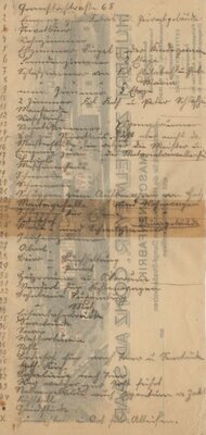 Ein Briefkopf der Firma Hubert Zettelmeyer, der mutmaßlich aus dem Jahre 1918 stammt und in der Trierer Druckerei J. Lintz hergestellte wurde. Der Briefkopf zeigt das umfangreiche Firmengelände, eingebettet in die näherer Konzer Umgebung. In den Unterlagen der 1972 verstorbenen Frl. Margarete Fremdling, hat ihr Nachlassverwalter aus Bonn, Unterlagen gefunden die im Zusammenhang mit dem Unternehmen Zettelmeyer stehen. Die 1903 geborene Dame startete, nach Auskunft des Testamentvollstreckers, unmittelbar nach der Ihrer Schulausbildung, ihr Berufsleben bei der Firma Zettelmeyer. Ab 1927 bis zu ihrem Tode 1972 nahm Frl. Fremdling eine Stellung als Sekretärin bei der Familie Bucherer in Bonn an. Von dem oben erwähnten Nachlassverwalter liegt ein persönliches Schreiben vor. Zitat: "In den Nachlassunterlagen befand sich -mit einer minutiösen Detailbeschreibung auf der Rückseite - der beigefügte Briefkopf, den ich, weil optisch schön, aufgehoben habe. Es mag sein, dass er für sie oder einen der Gesellschafter der Firma (Zettelmeyer) von Interesse sein mag. Wenn ja, würde es mich sehr freuen. Ihr Alfred Bucherer" Auf dem o.g. Briefkopf ist das damalige Firmengelände Zettelmeyer (ca.1918/20) mit der näheren Umgebung abgebildet. Darauf befinden sich, nachträglich in roter Farbe angebrachte Nummerierungen, einzelner Gebäude oder Gebäudeteile. Die dazugehörigen Erläuterungen hat Frl Fremdling auf der Rückseite des Briefkopfes handschriftlich in Sütterlin notiert. Über den Nachlass der Firma Zettelmeyer ist das Dokument in den Besitz vom Museum Roscheiderhof gekommen.