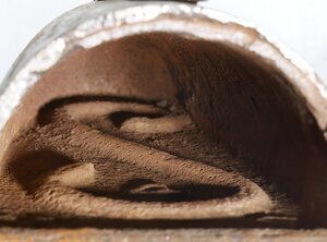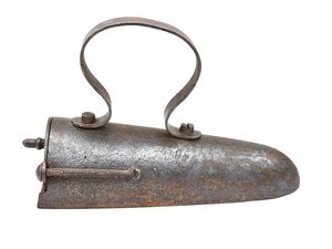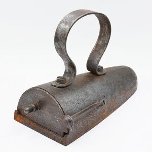 Der Name "Ochsenzungenbügeleisen" kommt daher, weil in das Innere des in einem Stück gegossenen Bügeleisens ein ochsenzungenförmiger Eisenkeil von hinten eingeschoben werden kann. Dieser wird zuerst auf einem Herd erhitzt, dann eingeschoben damit er den Boden des Bügeleisens erhitzt. Der Innenraum kann mit einer Klappe verschlossen werden, sodass der Eisenkeil nicht nach hinten herausfallen kann. Der Bügel in Rheinischer Form ist mit zwei Schrauben an dem Eisen befestigt. Der Boden und die gewölbte Decke des Innenraums besitzt oben 1 Rippe zur Fixierung des Keils. Unten - um den Boden des Bügeleisens nicht zu stark zu erhitzen - befindet sich eine Rippe in Form eines "S". Keine weiteren Gussmarken.