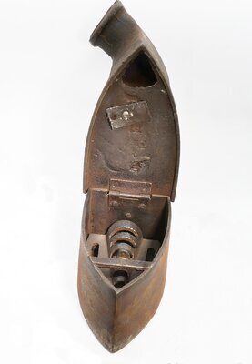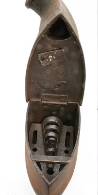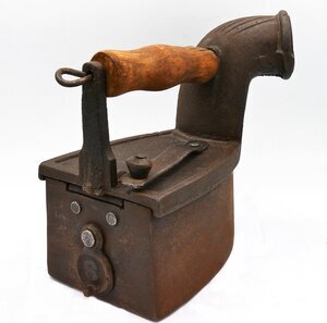 Kleines Kohlebügeleisen mit Kamin. In den Bauch des Bügeleisens wurde glühende (Holz-)Kohle eingefüllt um dessen Boden für das Bügeln zu erhitzen. Dazu konnte der Deckel, der mit einem Scharnier an der Rückseite verbunden war nach hinten hochgeklappt werden und nach der Befüllung wieder heruntergeklappt und mit einem Riegel verschlossen werden. Durch einen kleinen Kamin konnte der Rauch abziehen. Der Kamin ist relativ schlicht gestaltet, ohne den bei Vergleichsexemplaren oft vorhandenen Drachenkopf. Der gedrechselte Holzgriff ist auf der einen Seite am Kamin auf der anderen Seite auf einem Stift befestigt. Auf der Rückseite befindet sich eine Klappe mit der Aufschrift 6 zur Regulierung des Luftzugs. Oben befindet sich ein Hebel zum Gebrauch des Blasebalgs. Im Vergleich zu Kohlebügeleisen mit Rauchabzug unter dem Deckel des Eisens hat diese Konstruktion den Vorteil, dass die Büglerin nicht voll den Rauch abbekommt. Das Bügeleisen wurde wahlweise mit der Kaminöffnung links oder rechts angeboten, je nachdem ob die Büglerin Links- oder Rechtshänderin war.