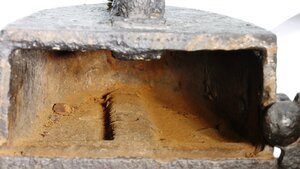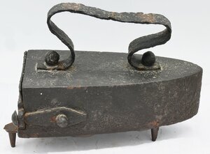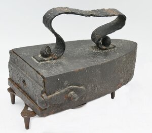 Bügeleisen werden seit dem 17. Jahrhundert zum Glätten der Wäsche verwendet. Kasteneisen besitzen einen dickeren und hohlen Rumpf, in den man am Herd oder Ofen aufgeheizte Metallstäbe oder einen Eisenkeil einfügen konnte. Wenn diese zu kalt waren wurden sie durch neu am Ofen aufgeheizte Exemplare ausgetauscht. Mehrer Exemplare der Metallstäbe waren dabei billiger als weitere Bügeleisen und ermöglichten ebenfalls ohne Unterbrechung zu bügeln. Kasteneisen gehören zu den ältensten Bügeleisentypen und lassen sich bis in die Mitte des 17. Jahrhunderts nachweisen. Das Prinzip des Kasteneisens besteht darin einen Bolzen im Feuer oder auf dem Herd zu erhitzen, diesen mit einer Zange aus dem Feuer zu holen und in das Kasteneisen auf den am Boden eingegossenen Hitzerost zu legen. Der Bolzen war typischerweise aus Gusseisen, Schmiedeeisen oder Stahl. Bolzeneisen hatten mehrere Nachteile: Die Wärmekapazität und damit die Bügeldauer eines Bolzens war recht begrenzt, ebenso die Lebensdauer der Bolzen. Insbesondere solche aus Gusseisen blätterten schnell ab. Das Herausnehmen der Bolzen aus dem Feuer und das Einbringen diese in das Kastenbügeleisen war schwierig, gefährlich und führte nicht selten zu Verletzungen. Ausserdem musste der Bolzen den Hohlraum gut ausfüllen. Andernfalls rutschten sie während des Bügelns herum. Dies führte dazu, dass Kasteneisen ab dem Ende des 19. Jahrhunderts sehr schnell durch Elektrobügeleisen ersetzt wurden. Das vorliegende Kasteneisen besitzt einen aus einem Eisenband hergestellen am Eisen angenieteten geschwungenen Bügel. Es hat an der Rückseite eine einfache, nach rechts aufklappbare Klappe, die im geschlossenen Zustand das Herausfalen des Bolzens verhindert. Der Bolzen ist leider nicht mehr vorhanden.