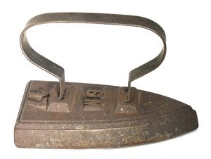 Kleines, sehr einfaches Flacheisen. Auf der Oberfläche des Eisens befindet sich die Gussmarke G M und an der Spitze die Ziffer 17 als Größenangabe. Das Eisen besitzt einen angeschweißten Bandeisengriff der Rheinischen Form und einen etwas erhöhten Rand. Der Rost zum Abstellen des (heißen) Bügeleisens ist vorhanden. Das leichte Flachbügeleisen gehört zu den massiven Volleisen, die aus Eisen oder Stahl geschmiedet oder gegossen und bereits ab dem 18. Jh. hergestellt wurden. Auf Grund seines geringen Gewichts und seiner flachen Sohle, die nahezu mühelos über die vorher mit Wasser besprengte Wäsche gleitet, erfreute es sich noch weit bis ins 20. Jahrhundert hinein großer Beliebtheit. Das Erhitzen auf dem Kohleofen oder in einer offenen Feuerstelle wie dem Kaminfeuer erforderte jedoch verschiedene Vorsichtsmaßnahmen, um die Bügelwäsche nicht zu beschmutzen oder sich am fest verbundenen Metallgriff zu verbrennen. Viele Büglerinnen wischten daher nach dem Erhitzen des Eisens mit einem Tuch, das sie an ihrer Schürze befestigt hatten, über die Bügelsohle. Als Hitzeschutz wurde oftmals ein dicker Handschuh oder ein Lappen, der um den Griff gewickelt wurde, verwendet.